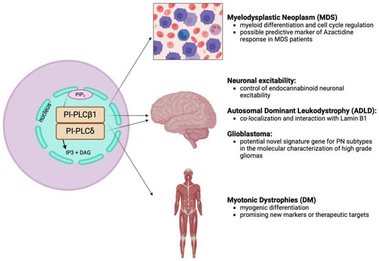 Given the emerging roles of these molecules within the nucleus, it is intriguing to explore the involvement of nuclear PLCs in various pathologies, potentially serving as promising new markers or therapeutic targets. The following sections will specifically focus on PI-PLCβ1, but it has to be underlined it is not the unique nuclear PI-PLC involved in pathologies. An example is represented by the nuclear PI-PLCγ1 involvement in oral squamous cell carcinoma, the proliferation and tumor growth of which can be suppressed through PI-PLCγ1 signaling inhibition by p120 [44].