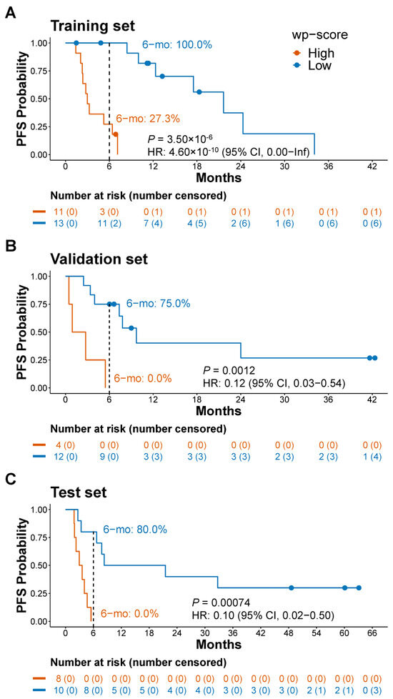 In the training set, we correlated 5hmC levels with PFS and identified 104 genes significantly associated with PFS (p < 0.05; Table S2). We discovered a 16-gene signature through feature selection and built a 5hmC predictive model based on these signature genes (Table S2). We then calculated a wp-score that represented the 5hmC level of the signature genes for each sample (Table S3). We defined a cut-off wp-score of 175.0 to maximize the sensitivity for detecting patients with ICI treatment response. Low wp-scores were significantly associated with a longer PFS compared to high wp-scores [median 12.3 versus 3.0 months; p = 3.5 × 10−6; HR: 4.6 × 10−10; 95% confidence interval (CI), 0–infinite; Figure 1A]. The estimated proportion of patients who were alive without disease progression at six months was 100.0% among those with a low wp-score and 27.3% for those with a high wp-score (Figure 1A).