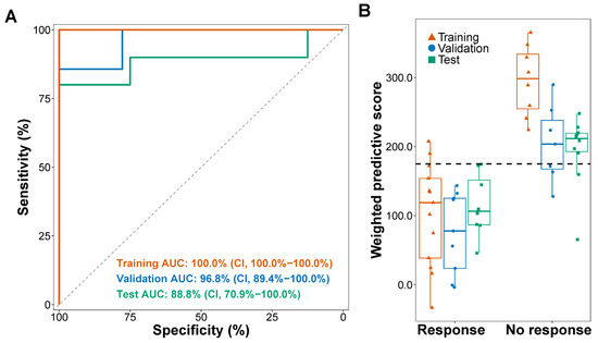 ORR was 100.0% (95% CI, 71.5–100.0%) in patients with low wp-scores and 20.0% (95% CI, 2.5–55.6%) in individuals with high wp-scores in the training set (p = 0.00022; Table 1). Similarly, in the validation set, the ORR was 75.0% (95% CI, 42.8–94.5%) in individuals with low wp-scores and 0.0% (95% CI, 0.0–60.2%) in those with high wp-scores (p = 0.019; Table 1). In the test set, the ORR was 80.0% (95% CI, 44.4–97.5%) in patients with low wp-scores and 0.0% (95% CI, 0.0–36.9%) in patients with high wp-scores (p = 0.0011; Table 1). The wp-score achieved an area under the curve (AUC) of 100.0% (95% CI, 100.0–100.0%) in the training set, 96.8% (95% CI, 89.4–100.0%) in the validation set, and 88.8% (95% CI, 70.9–100.0%) in the test set (Figure 2A). Wp-scores were significantly lower in patients who responded to the ICI treatment compared to non-responders in the training (p = 0.0073), validation (p = 0.00070), and test (p = 0.0044) sets (Figure 2B).