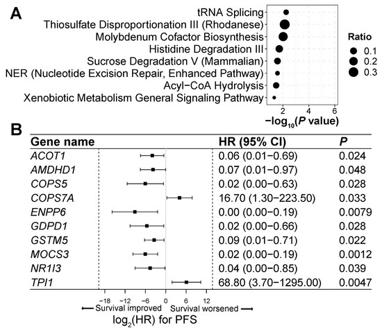 To delineate the molecular mechanisms underlying the ICI treatment response, we analyzed 104 genes for which aberrant 5hmC levels were significantly associated with PFS among ICI-treated lung cancer patients (Table S2). These genes were significantly enriched in eight canonical signaling pathways, including nucleotide excision repair and enhanced pathway, xenobiotic metabolism general signaling pathway, and sucrose degradation V pathways (p < 0.05; Figure 4A; Table S2). Genes associated with cell immune functions were enriched in these pathways, such as COPS5, GSTM5, and TPI1 (Figure 4B; Table S2), indicating the critical role of 5hmC modifications in immune response in lung cancer treatment.
