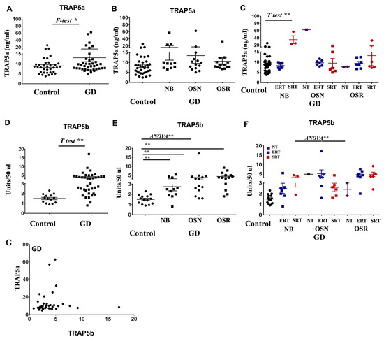 Plasma TRAP5a and TRAP5b concentrations. (A) TRAP5a level, Control vs. GD. F-Test, two tail p < 0.0001, unpaired t-test one tail p = 0.0323, two tail p = 0.0646, Control n = 35, GD n = 39. (B) TRAP5a concentrations in control subjects and GD with no bone complication (NB), osteopenia (OSN), and osteoporosis (OSR). There is no significant difference between NB, OSN, and OSR. Control n = 35, GD-NB n = 11, GD-OSN n = 14, GD-OSR n = 14. (C) Relationship between the TRAP5a plasma level and BMD in patients with GD on different therapies: no treatments—NT, NAÏVE, enzyme replacement therapy—ERT, and substrate reduction therapy—SRT. The analysis shows that there is only a significant difference between the control group and patients with normal BMD who are on SRT therapy. The unpaired t-test one tail p < 0.001. (D) TRAP5b level, Control vs. GD. p < 0.05 t-test. Control n = 14, GD patients: n = 39. (E) TRAP5b level in control subjects and patients with GD with no bone complication (N), osteopenia (OSN), and osteoporosis (OSR). ** p < 0.05; Kruskal–Wallis’s test, one-way ANOVA. (F) Relationship between the level of TRAP5b and BMD in patients with GD who are on different therapies. The Kruskal–Wallis’s test indicates significant differences between the groups (p < 0.0001). Dunn’s multiple comparison test shows significant differences between the control group and OSN/ERT, controls and OSR/ERT, and controls and OSR/SRT cohorts. Two-group comparisons using the unpaired t-test show significant differences between Control and NB cohorts (SRT and ERT), Control and OSN (SRT and ERT), and Control and OSR (SRT and ERT). Due to the limited number of samples, the “No treatment” OSN and OSR were excluded from the analysis. (G) Scatterplot analysis of TRAP5a and TRAP5b levels in patients with GD. Pearson and Spearman correlation analysis determined the absence of correlation between TRAP5a and TRAP5b. Pearson correlation r = 0.06, p = 0.35, Spearman correlation r = 0.27, p = 0.08. The asterisk (*) p ≤ 0.05; (**) p ≤ 0.01.