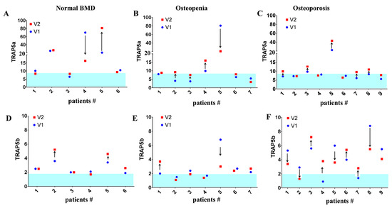 Longitudinal dynamics of TRAP5a and TRAP5b. Visit 1 (V1) is the initial visit, and visit 5 (V5) is the follow-up visit, which is an average of 24 months later. (A–C) Plasma level of TRAP5a level within 24 months of monitoring. GD patients with normal BMD (A), osteopenia (B), and osteoporosis (C). (D–F) Plasma level of TRAP5b within 24 months of monitoring. GD patients with normal BMD (D), with osteopenia (E), and osteoporosis (F). Blue color indicates the normal range of TRAP5a or TRAP5b.