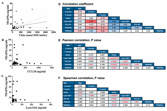Correlation between TRAP5a and GD clinical biomarkers Chito, Lyso-Gb1, and CCL18. (A) Scatterplot analysis of TRAP5a and Chito. The correlation between TRAP5a and Chito was determined by Spearman correlation analysis. p < 0.05 was considered statistically significant. (B,C) Scatterplot analysis of TRAP5a, Lyso-Gb1 (B), and CCL18 (C) showed no correlation between biomarkers. (D–F) Correlation matrix and hierarchical clustering. Correlation coefficients for measurements of biomarkers and clinical parameters are visualized by tile-color intensities (blue color, strong; light red color, weak, deep red color, negative correlation). Correlation coefficient = 0.8, strong positive relationships; correlation coefficient = between 0.5 and 0.7, a moderate positive relationship; correlation coefficient between 0.3 and 0.5 indicates variables with a low correlation. Pearson’s correlation (E) and Spearman correlation (F) p-values are labeled inside the titles. The red color indicates significant differences, p < 0.05.