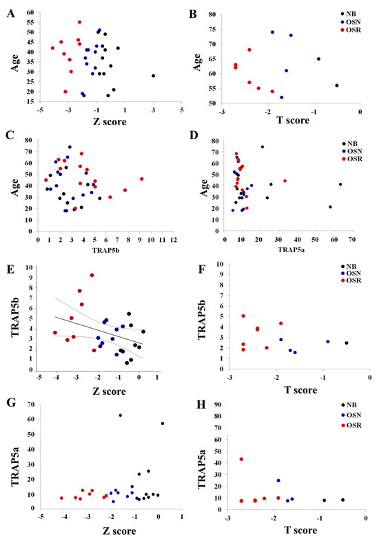Comparison of age group, BMD score, and TRAP5 in GD cohort. (A,B) Scatterplot analysis of age and Z- or T-score. (C,D) Scatterplot analysis of age and TRAP5b (B) and TRAP5a (C) showed no correlation between age and biomarkers. (E,F) The correlation between TRAP5b and Z-score (E) and TRAP5b and T-score (F). TRAP5b and Z-score were determined by linear Pearson correlation analysis. r = −0.4, p < 0.05. was considered statistically significant, with medium correlation. (G,H) A scatterplot analysis of TRAP5a and Z-score (G) or T-score (H) showed no correlation between biomarkers.