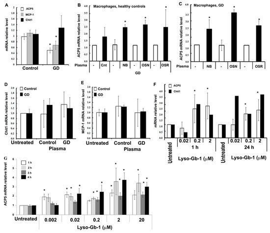 Next, we investigated the role of Lyso-Gb-1 levels in the regulation of ACP5 transcription in macrophages from patients with GD. Treatment of macrophages with Lyso-Gb-1 induced the ACP5 expression level in a concentration- and time-dependent manner (Figure 5F). Additionally, we would like to mention that the activation of ACP5 mRNA expression was very robust after just 1 h of treatment with 0.2 and 2 μM of Lyso-Gb-1 (Figure 5F).