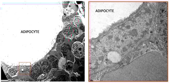 A Transmission Electron Microscopy of human normal bone marrow. Left: an adipocyte is surrounded by different types of hematopoietic cells. The squared area is enlarged in the right panel showing the nucleus of the adipocyte and the close connection with hematopoietic cells. Bar: 3 mm in left panel and 0.5 mm in right panel.