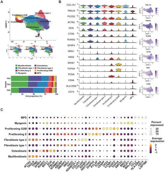 Minor interpatient variability was observed in cell-type proportions despite the uniform cellular composition (corresponding cell counts and proportions are available in Table S3). Specifically, the FD3 and FD4 samples exhibited a higher proportion of myofibroblasts (38.1 and 37.6%, respectively) compared to 17.2% in the FD5 sample. Conversely, osteoblasts accounted for the highest proportion of cells in the FD5 sample (31.3%). Overall, the proportions of myogenic and MPS cells were relatively smaller, particularly in the FD3 sample, where only 51 and 66 cells (0.6 and 0.8% of the total cells) were assigned to the myogenic and MPS clusters, respectively. These differences may be attributed to factors such as the lesion site and its status of lesion development and aggression. Unfortunately, information regarding the time of lesion initiation and the pathological and biological behavior of the lesion in FD patients was not available. However, upon closer examination of the lesion sites, it was observed that lesions in FD3 and FD4 samples were located in the lower jaw, whereas the lesion in FD5 was situated in the forehead and upper orbit. This discrepancy in lesion site potentially explains the differences in the proportions of myofibroblasts and osteoblasts observed among the samples.
