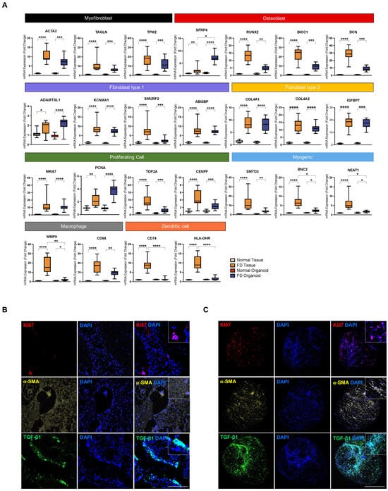 The gene signatures for interrogating the cellular components of PDOs were derived from our scRNA-seq dataset. Enrichment for the three major cell constituents—myofibroblasts, osteoblasts, and stromal fibroblasts—was determined using specific markers: TAGLN, TPM2, and ACTA2 for myofibroblasts; SFRP4, RUNX2, BICC1, and DCN for osteoblasts; and ADAMTSL1, KCNMA1, SMURF2, and ABI3BP for stromal fibroblasts (Figure 4A). Normal control-derived organoids served as the comparison group. RT-qPCR confirmed a significant upregulation of mRNAs encoding markers for myofibroblast, osteoblast, and stromal fibroblast, suggesting conserved populations of all three cell types. Intriguingly, a notable increase in SFRP4 expression was observed in PDOs rather than in FD tissues. SFRP4 is known to play a pivotal role in osteoblast differentiation, but its overexpression has been linked to the inhibition of bone formation by suppressing osteoblast proliferation and maturation []. Therefore, its prominent expression in PDOs may be attributed to the differentiated state of the PDOs, as SFRP4 is typically highly expressed in mature osteoblasts [].