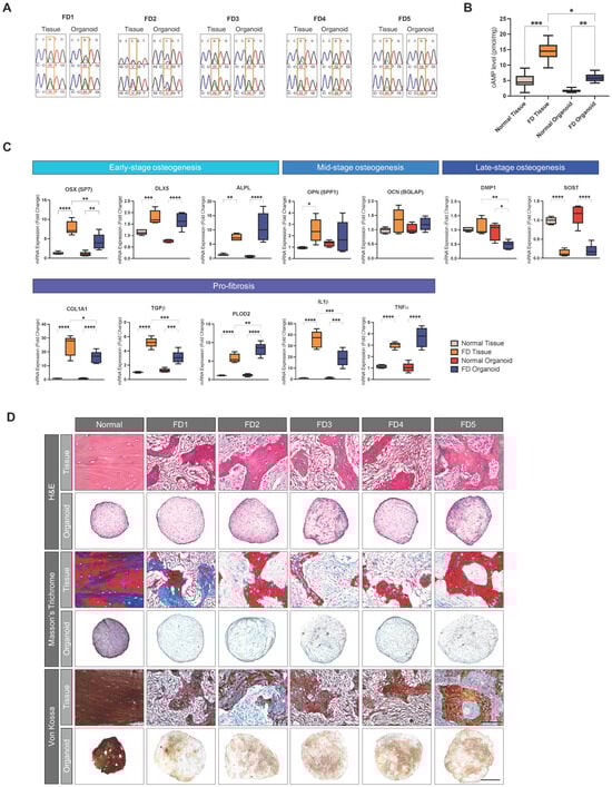 Histological evaluation of parent tissues and derived organoids. (A) Genomic sanger sequencing for GNAS mutation in parent tissues and derived organoids. (B) Boxplot of cAMP cellular content in parent tissues and in total cell lysate of derived organoids. (C) Boxplots of mRNA expressions of selected osteogenic and pro-fibrotic markers in parent tissues and derived organoids. Boxes indicate the interquartile range, separated by median line. Whiskers indicate the maximum and minimum values. The asterisks denote significant differences (**** p value < 0.0001, *** p value < 0.001, ** p value <0.01, * p value < 0.05, Kruskal–Wallis test). (D) H&E staining, Masson’s trichome staining, and von Kossa staining. Masson’s trichrome staining: blue, collagen content. Von Kossa staining: brown, calcium mineral deposits. Scale bar, 100 μm.