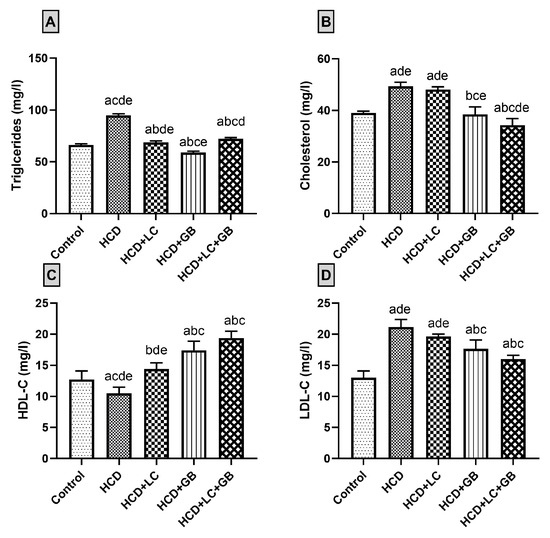 (A–D) Lipid profile charts. All values are expressed as the mean ± SD (n = 6). Triglycerides (A), cholesterol (B), HDL-C ((C) high-density lipoprotein cholesterol), and LDL-C ((D) low-density lipoprotein cholesterol) are shown. The letters a–d and e indicate significant differences (p-value < 0.05) between groups in comparison with the control, HCD, HCD + LC, HCD + GB, and HCD + LC + GB groups, respectively.