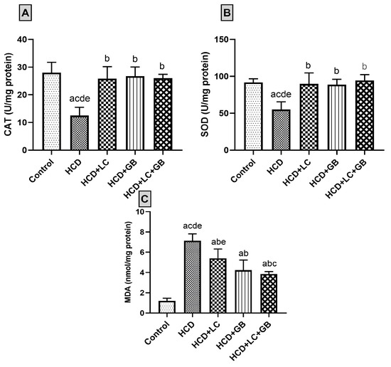 (A–C) Antioxidant status charts. All values are expressed as the mean ± SD (n = 6). Catalase ((A); CAT), superoxide dismutase ((B); SOD), and malonaldehyde ((C); MDA) activities. The letters a–d and e indicate significant differences (p-value < 0.05) between groups in comparison with the control, HCD, HCD + LC, HCD + GB, and HCD + LC + GB groups, respectively.