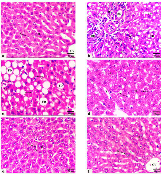 Liver H. and E. sections of the control rats exhibited typical hepatic parenchyma of classic lobules with radially arranged polyhedral hepatocytes and blood sinusoids lined by endothelium and some von Kupffer cells (Figure 3a). After 8 weeks of HCD feeding, liver sections revealed multiple histopathological lesions throughout the hepatic parenchyma, including microvesicular and macrovesicular hepatic steatosis, balloon degeneration, inflammation, focal necrotic areas with pyknotic nuclei, and abundant apoptosis. Hepatocellular degeneration occurred with enlarged vacuolated hepatocytes, and the nuclei were displaced toward the cell periphery by diffuse intracytoplasmic fat globules. In addition, portal hepatitis and mononuclear inflammatory cell infiltration around dilated congested blood vessels and proliferated bile ducts of the portal areas were frequently observed (Figure 3b,c). However, liver sections from animals fed HCD supplemented with LC or/and GB for 8 weeks exhibited noticeable alleviation of these histopathological features (Figure 3d–f). LC or GB mono-treatment resulted in mild hepatocellular vacuolation, dilated sinusoids, increased Kupffer cells, and few pyknotic nuclei scattered throughout the tissue (Figure 3d,e). All histopathological lesions became less prominent and more pronounced in livers obtained from rats cotreated with both LC and GB, where the hepatocytes, blood sinusoids, and central veins retained a normal appearance similar to that of the control animals (Figure 3f).