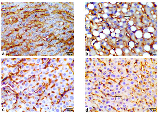 Following animal dissection, liver samples were promptly fixed in 10% neutral formalin. Sections were prepared using the conventional paraffin embedding method, and histological investigation was performed under a light microscope using 4–5 μm thick sections stained with hematoxylin and eosin (H. and E.) and Masson’s trichrome [34,35]. Immunohistochemical staining was performed on paraffin-embedded liver tissue sections. Primary antibodies against the glucagon-like peptide-1 receptor (GLP-1R, 1:200, NBP1-97308, Novus Biologicals, USA) and beta-catenin (β-Cat, BD Biosciences, San Jose, CA) were used as described by Jensen et al. [36] and Zou et al. [37], respectively. Subsequently, the slides were exposed to 3,3’-diaminobenzidine tetrahydrochloride (DAB) substrate from Santa Cruz, USA, followed by washing in Tris-buffered saline (TBS) and counterstaining with hematoxylin.