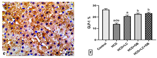 (a–f) Photomicrographs obtained from IHC liver sections of control rats ((a)/G1), HCD-fed rats ((b)/G2), HCD + LC-fed rats ((c)/G3), HCD + GB-fed rats ((d)/G4), and HCD + LC + GB-fed rats ((e)/G5) showing glucagon-like peptide-1 expression (arrows). Scale bar, 50 µm. (f) The graph shows the semiquantitative scoring of the percentage of positive staining; the results are presented as the mean ± SD, with a sample size of n = 6. The letters on columns a–e indicate significant differences (p-value < 0.05) between groups and the control, HCD, HCD + LC, HCD + GB, and HCD + LC + GB groups, respectively. IHC, magnification 40×, scale bar 50 µm.