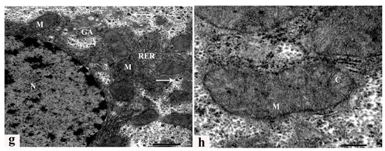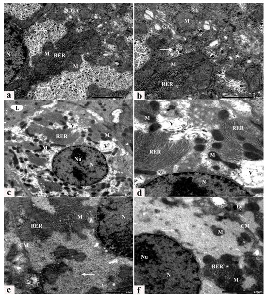 (a–h) Electron micrographs of a hepatocyte from a control rat (a,b), an HCD-fed rat (c,d), and animals that received HCD + LC (e), HCD + GB (f), and HCD + LC + GB (g,h) showing the cell membrane (CM), nucleus (N), nucleolus (NU), rough endoplasmic reticulum (rER), Golgi apparatus (GA), mitochondria (M), cristae (C), glycogen rosettes (arrows), lysosomes (LY), degenerated lytic cytoplasm with large vacuoles (V), Uranvl acetate, and lead citrate stain.