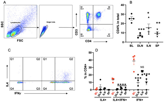 Bovine memory CD4+ T cells in healthy beef cattle are a mixture of Th1 and Th0. Lymphocytes are gated in peripheral blood mononuclear cells (PBMCs) or lymphoid tissues and examined for the expression of surface markers and cytokines. (A,B) Gating (B) and comparison of CD4+ T cells % in different tissues of grass-fed cattle. (C,D) Purified PBMCs or single-cell suspension of lymphoid tissue are stimulated with the activation cocktail for 4 h before intracellular staining for IFNγ and IL4, plus surface staining with antibodies to identify CD4+ T cells [36]. (C) Gating strategies for IFNγ- or IL4-producing cell in total CD4+ T cells. (D) Comparison of IFNγ or IL4 expression in CD4+ T cells. Percentage of IL4+ only: Q1; IL4+/IFNγ+ (double-positive): Q2; IFNγ+ only: Q3. Background in the isotype control is subtracted from all the data in (D). BL: blood; DLNs: abomasal draining lymph nodes; ILNs: inguinal lymph nodes; and SP: spleen. Data have been analyzed by one-way ANOVA with Tukey’s multiple comparison test. Asterisks indicate statistical significance compared to BL in (B,D). * p < 0.05; ** p < 0.01; *** p < 0.001; and **** p < 0.0001. NS: not significant. The same analysis has been performed in the rest of the figures, unless mentioned otherwise.