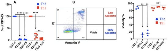 In mice, reducing TCR stimulation strength allowed one to shift CD4+ differentiation toward the IL4+ phenotype [88,89,90,91,92]. To investigate if IL4 expression could be boosted in a similar way, isolated naïve CD4+ T cells were stimulated with plate-bound anti-bovine CD3 antibodies coated at varied concentrations under both Th1 and Th2 conditions, as illustrated in Figure 2B. Even three-fold dilution (3×) of anti-bovine CD3 reduced Th2 proliferation by more than 95%, while cellular expansion under Th1 conditions was reduced by 80% at a 10× dilution (Figure 4A). Furthermore, the viability of the tiny number of surviving cells in Th2 cells was reduced to roughly 20%, demonstrating that even a 3× dilution of CD3 essentially eliminated Th2 survival (>99%) compared to the 1× CD3 control (Figure 4B). In Th1 cells, the viability of the remaining cells at 10× diluted CD3 was similar to that induced in the original anti-CD3 concentration (1×), about 90% (Figure 4B), indicating that the survival of differentiating bovine Th2 cells is more dependent on intense TCR stimulation than Th1 cells. Therefore, in contrast to mice and humans, a lower TCR stimulation strength is detrimental to the survival of bovine Th2 cells.