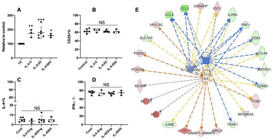 Extra recombinant bovine IL4 leads to enhanced Th2 differentiation. Naïve CD4+ T cells are differentiated under Th2 condition in the presence of additional recombinant bovine IL4. IL4 is tested at three different concentrations: 0.05 ng/mL, 0.5 ng/mL, and 5 ng/mL. Comparison of expansion (A), CD5 expression (B), and IFNγ and IL4 expression (C). (D) Th2 cells differentiated in the presence of 0.5 µg/mL recombinant bovine IL4 are analyzed for their protein profiles, in contrast to Th2 control cells. IPA is used to predict the effect function of the additional rbIL4. (E) The network analysis is based on the differentially expressed proteins between rbIL4+Th2 vs. Th2.