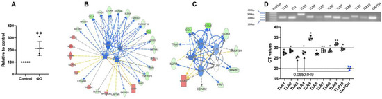 Parasite extract leads to the inhibition of Th2 differentiation. Naïve CD4 T cells are differentiated in the presence or absence of OO under Th2 conditions, as described in Figure 2B. Cells are harvested and analyzed for changes in their protein profiles, and the differentially expressed proteins are further analyzed by IPA. (A) Comparison of cell expansion influenced by OO. (B) Predicted effector function of OO on Th2 differentiation. (C) Predicted OO-affected network. The network analysis is based on the predicted activation and inhibition states of the upstream regulators identified in the Th2+OO versus Th2. (D) Detection of mRNA of TLRs. Naïve CD4 T cells are analyzed for the presence of TLRs.