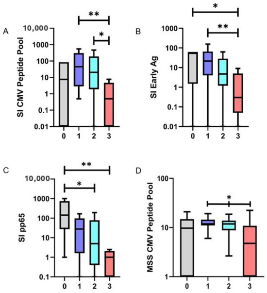 Stimulation Index (SI) of the tested antigens based on the number of administered immunosuppressants (x-axis) (A–C); IFN-γ release from antiviral T-cells, represented as mean spot size (MSS), in relation to the CMV peptide pool, corresponding to an escalation in the number of administered immunosuppressants (D). CMV = Cytomegalovirus, Ag = Antigen; ** p < 0.01; * p < 0.05.