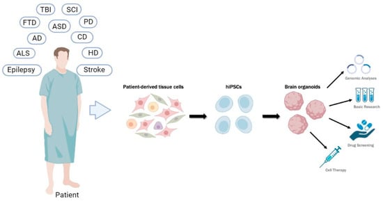 The investigation of neuropathologies frequently encounters challenges in establishing suitable study models. Neurodegenerative disorders like Alzheimer’s disease (AD) pose significant hurdles due to their complex interplay of extracellular and intracellular factors. For instance, understanding the immune response of patients to pathological protein aggregates like Aβ plaque, the distribution of intracellular neurofibrillary tangles (NTF), and the density of neuritic plaques proves particularly intricate [1]. In neurodevelopmental disorders, delving into the early stages of the disease poses a particular challenge when attempting to replicate it in cellular and animal models. This complexity is evident in conditions like temporal lobe epilepsies [2,3]. Conversely, when it comes to tissue injuries such as spinal cord injury (SCI) and strokes, animal models predominantly serve as the primary investigative tool, while treatment emerges as the principal obstacle [4,5]. Across all these scenarios, there exists a shared objective in exploring the potential for developing disease-specific models or therapeutic interventions.