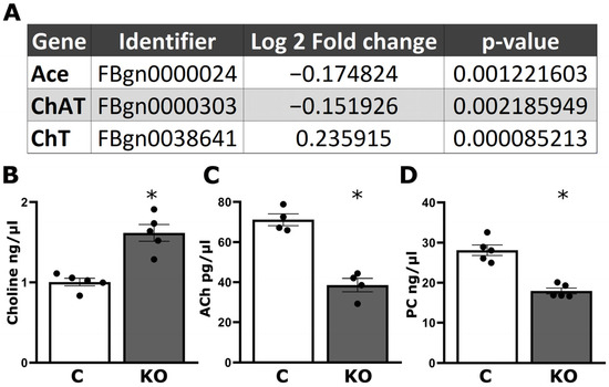 Profiling changes in the brain proteome of KO animals with mass spectrometry revealed that, relative to controls, 503 proteins were differentially abundant (FDR ≤ 0.05) in the mutants, demonstrating that dTau loss precipitates major changes in neuronal proteostasis [11]. As quantified in Figure 1A, these included significant increases in the levels of the high-affinity choline transporter 1 (ChT) and decreases in the acetylcholine hydrolyzing enzyme acetylcholinesterase (Ace) and the enzyme responsible for Ach synthesis, choline O-acetyltransferase (ChaT). This elevation in choline levels (Figure 1B) is not reflected in the levels of its metabolites Ach and PC, which are highly reduced (Figure 1C,D). Importantly for this interpretation, our data are collected from whole CNS lysates and as such, they are not informative as to whether these changes occur in all neurons, in presynaptic and/or postsynaptic neurons of the broadly distributed cholinergic neurons in the fly brain.