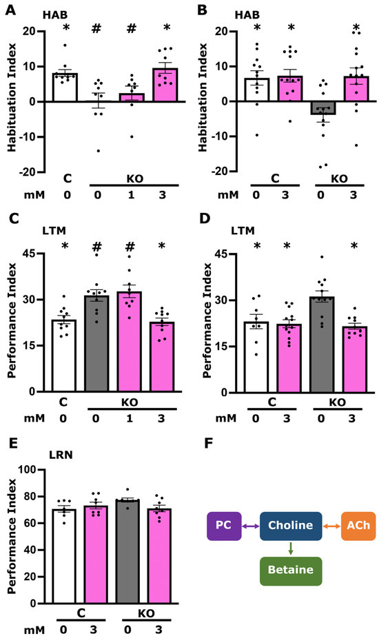 Choline treatment restores habituation deficits and normalizes memory performance of dTauKO mutants. The white bars denote untreated control flies (C), dark grey bars represent untreated mutant flies (KO), and magenta bars indicate choline-treated flies. The concentration of choline administered is specified beneath each bar. Habituation (the reduction in foot shock avoidance upon prior repeated exposure to foot shocks) and Long-Term Memory (LTM) are measured as detailed in Section 2. (A) Habituation of KO animals to two distinct choline concentrations (1 mM and 3 mM). (B) Habituation of control and KO flies, both receiving a 3 mM choline treatment. (C) Memory performance of KO animals treated with varying choline concentrations (1 mM and 3 mM). (D,E) assess memory and learning performance, respectively, in control and KO flies treated with a 3 mM concentration of choline. Data are presented as means ± SEMs for n ≥ 8 across all genotypes. The * denotes statistical significance compared to untreated dTauKO flies, while # signifies statistical significance relative to untreated control flies. A comprehensive summary of statistical analyses is provided in Table S1. (F) A cartoon illustrating the metabolic pathways of choline (Ch), highlighting its conversion into phosphatidylcholine (PC), acetylcholine (Ach), and betaine. The pathway begins with choline being metabolized into phosphatidylcholine through a reversible enzymatic reaction. From phosphatidylcholine, choline can either be directly converted back into choline or further metabolized into acetylcholine, also through a reversible process, serving as a crucial neurotransmitter. Additionally, the figure depicts the irreversible conversion of choline into betaine. Betaine serves as an important osmolyte and methyl donor in various physiological processes. The reversible pathways are indicated by double-headed arrows, while the irreversible pathway to betaine is marked with a single-headed arrow, emphasizing the directionality of these metabolic reactions.