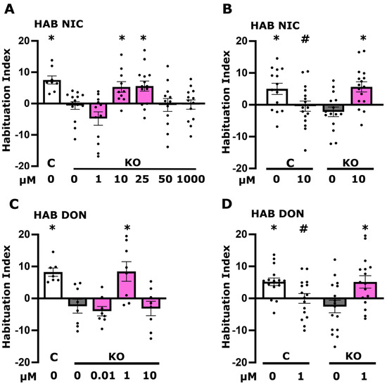 Cholinergic neurotransmission affects habituation response to foot shocks. Dark grey bars denote untreated mutant flies (KO), the white bar signifies untreated control (C) flies, and magenta bars represent treated flies. Habituation (the reduction in foot shock avoidance upon prior repeated exposure to foot shocks) is measured as detailed in Section 2. The specific concentration of the compound applied is detailed below each bar. (A) Habituation of KO animals following treatment with various concentrations of nicotine (1 μM, 10 μM, 25 μM, 50 μM, and 1 mM). (B) Habituation response of control and KO flies to a 10 μM nicotine treatment, illustrating the effects on both genotypes. (C) Habituation of KO animals to different concentrations of Donepezil (10 nM, 1 μM, and 10 μM). (D) Habituation response of control and KO flies to a 1 μM donepezil treatment, assessing its impact on both KO and control animals. Results are presented as means ± SEMs for n ≥ 8 across all genotypes. The * indicates statistical significance compared to untreated KO flies, while # denotes statistical significance relative to untreated control flies. A detailed summary of statistical analyses is provided in Table S2.