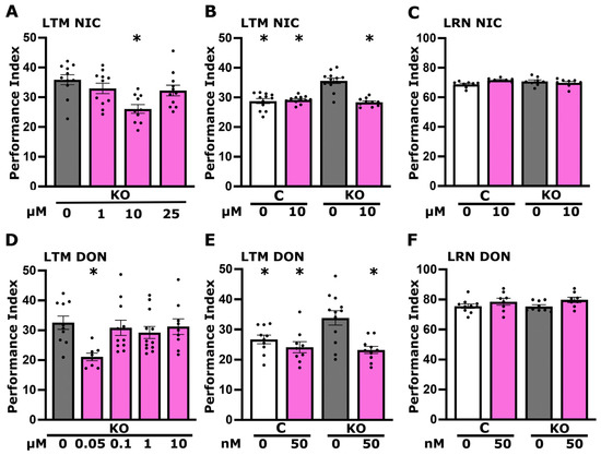 Cholinergic neurotransmission impacts LTM. Dark grey bars represent untreated mutant flies (KO), the white bar indicates untreated control flies (C), and magenta bars denote flies treated with specific compounds, with concentrations specified beneath each bar. Long-Term-Memory (LTM) is measured as detailed in Section 2. (A) Memory performance of KO animals following treatment with three different nicotine concentrations (1 μM, 10 μM, and 25 μM). (B) Memory and (C) learning of KO and control animals treated with 10 μM nicotine. (D) Memory performance of dTauKO animals treated with various concentrations (50 nM, 100 nM, 1 μM, and 10 μM) of donepezil. (E) Memory and (F) learning performance of KO and control animals upon treatment with 50 nM donepezil. Data are expressed as means ± SEMs for n ≥ 8 across all genotypes. The * indicates statistical significance compared to untreated KO flies. A detailed summary of the statistical analyses is provided in Table S4.