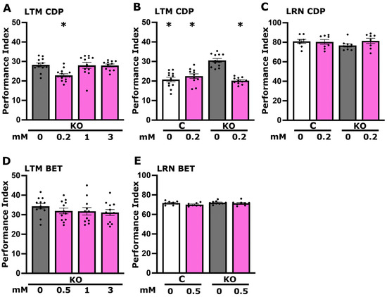 CDP-choline effectively normalizes the memory of dTau KO mutants, contrasting with the effects of betaine. Dark grey bars represent untreated mutant flies (KO), the white bar denotes untreated control flies (C), and magenta bars indicate flies treated with specific compounds, with the concentrations detailed below each bar. Long- Term Memory (LTM) is measured as detailed in Section 2. (A) Impact of various concentrations of CDP-choline (200 μM, 1 mM, and 3 mM) on the memory of KO flies. (B) Memory and (C) learning of KO and control animals treated with 200 μM CDP-choline, demonstrating the compound’s influence on both genotypes. (D) Memory of KO animals following treatment with various concentrations of betaine (0.5 mM, 1 mM, and 3 mM). (E) Learning performance of both control and KO flies treated with 0.5 Mm betaine. Results are presented as means ± SEMs for n ≥ 8 across all genotypes. The * indicates statistical significance compared to untreated KO flies. A detailed summary of the statistical analyses is provided in Table S5.