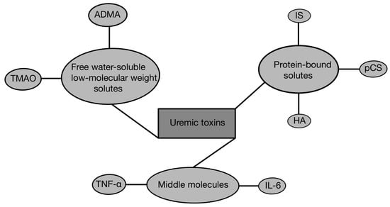 Figure 2. Classification of uremic toxins based on solubility [10]. ADMA—asymmetric dimethylarginine; TMAO—trimethylamine N-oxide; TNF-α—tumor necrosis factor α; IL-6—interleukin 6; HA—hippuric acid; pCS—p-cresyl sulfate; IS—indoxyl sulfate.