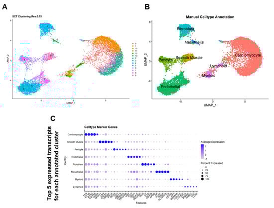 Enhanced workflow and unbiased automatic cell labelling of human cardiac scRNA data enhances identification of cardiac cell populations. UMAP reduction of full Wang et al.’s dataset labelled with (A) unsupervised SNN clustering at 0.75 resolution and (B) after semi-unsupervised cell-type annotation. (C) Top 5 most highly expressed transcripts for each annotated cell cluster.