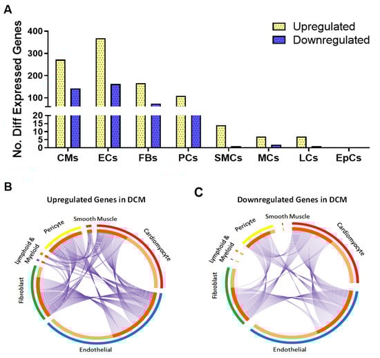 Differential transcriptional changes in cardiac cell types in DCM. (A) Number of differentially expressed transcripts in each cardiac cell population in DCM. Circos plots of differentially expressed genes that were (B) upregulated and (C) downregulated in each of the cardiac cell populations. Blue lines indicate transcripts that are conserved between different cell populations.