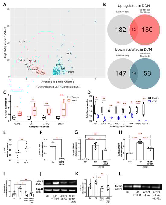 Identification and in vitro validation of fibroblast-specific differentially expressed genes in DCM. (A) Volcano plot representing differentially expressed genes in cardiac fibroblasts from DCM hearts. (B) Venn diagram depicting identification of disease-relevant candidate genes by comparing DEGs from bulk RNA-seq of heart tissue with scRNA-seq fibroblast cell data. In vitro validation of disease-relevant candidates that show significant (C) upregulation and (D) downregulation in response to 72 h TGFβ activation (n = 5). (E) Proteomic data generated from mass spectrometry-based analysis of LV heart tissue from non-failure patients (NF) (n = 7) and dilated cardiomyopathy patients (DCM) (n = 5). (F) RT-PCR analysis of AEBP1 in HCFs transfected with 25 nM AEBP1 siRNA (or scrambled control) (n = 3). RT-PCR analysis of (G) αSMA and (H) col1α1 in HCFs transfected with 25 nM AEBP1 siRNA (or scrambled control) in the presence or absence of TGFβ1 (n = 4). Protein levels of (I) αSMA and (K) col1α1 measured in lysates (n = 4) and supernatants (n = 4), respectively, from HCFs transfected with 25nM AEBP1 siRNA (or scrambled control) in the presence or absence of TGFβ1 using Western blot and densitometry analysis. (J,L) show representative images of Western blots. * indicates p =< 0.05, ** indicates p =< 0.005, *** indicates p =< 0.0005, **** indicates p =< 0.00005).