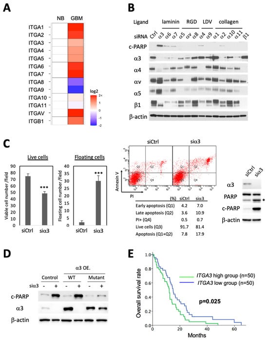 Integrin α3 promotes glioma survival. (A) α/β1 integrin subunit mRNA expression profile in GBM (2021 WHO CNS grade 4; IDHwt; n = 387) vs. normal brain (NB; n = 10) from TCGA dataset (2016-01-28 release date); (B) Immunoblot analysis of LN229 GBM cells 72 h after transfection with indicated integrin subunit siRNAs (30 nM). Cells were switched to a serum-free medium 24 h before cell lysis. Integrin α subunits are grouped by ligand specificity. (C) Cell viability/death analyses of LN229 cells transfected with siCtrl or siα3 (30 nM) for 96 h. Cell culture supernatant was collected, and floating cells were stained using trypan blue. Stained dead cells were counted in a hemocytometer (left panel, floating cells). Adherent cells were detached by trypsin and their viability evaluated via trypan blue staining. Average number of unstained viable cells counted per square in the hemocytometer are shown (left panel, live cells), student’s t-test (***; p < 0.001). Annexin V/propidium iodide (PI) flow cytometry analysis (middle panel). Immunoblot analysis of the flow samples (right panel). *; cleaved form of PARP; (D) Immunoblot analysis of LN229 cells +/− stable expression of wild type or siα3-resistant (mutant) α3 integrin treated with siα3 or siCtrl for 96 h. Note that rescue with siα3-resistant (mutant) α3 integrin prevents induction of PARP cleavage; (E) Kaplan–Meier survival curves of GBM (2021 WHO CNS grade 4; IDHwt) patients with lowest or highest (50 cases each) ITGA3 mRNA expression using TCGA dataset (n = 357).