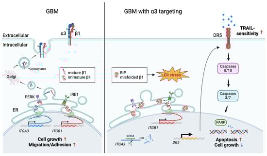 In this study, we examined the importance of α/β1 integrins for GBM cell growth and revealed that targeting of the α3 subunit triggers ER stress and proapoptotic signaling that can be exploited for therapeutic gain.