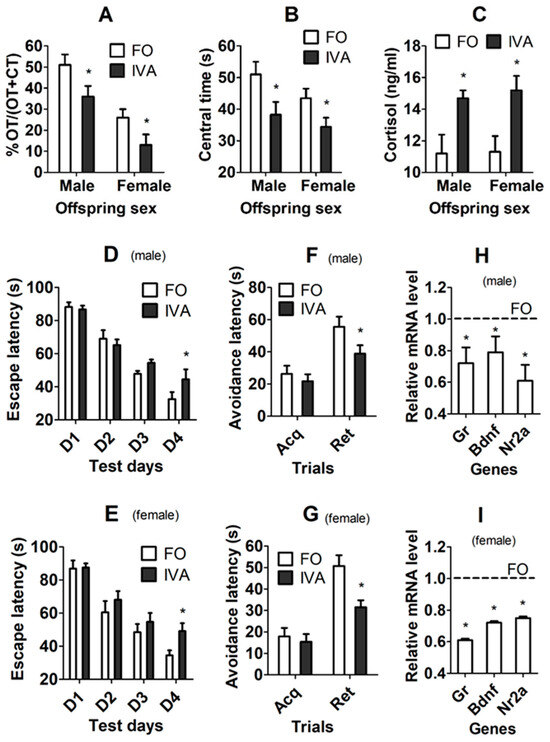 Effects of oocyte IVA on anxiety-like behavior and spatial/fear learning/memory in F1 offspring. (A–I) Open-arm time (OT)/(OT + closed arm time (CT)) of EPM, time (s) in central area of OFT, serum cortisol concentration, escape latency (s) on different days in MWM test, latency time (s) of acquisition (Acq) and retention (Ret) trials in PAT and mRNA levels of Gr, Bdnf and Nr2a genes in hippocampus, respectively, in F1 male and female offspring after transfer of embryos from freshly ovulated (FO) or IVA oocytes. (H,I) The value in FO offspring was set to one (dotted line) and the value in IVA offspring was expressed relative to one. For behavioral tests, each treatment contained 19–26 mice from 9–10 recipients. For cortisol measurement, each treatment was repeated 6–7 times, with each replicate containing serum from one mouse from a different recipient. For RT-qPCR assays, each treatment was repeated 6 times, with each replicate containing one mouse from a different litter. * Significant difference (p < 0.05) from FO offspring. Refer to Table S3-2 for numbers of mice used in different graphs.