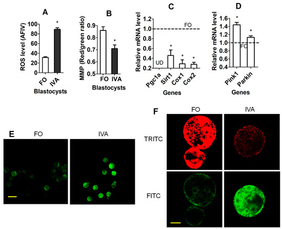Effects of IVA on OS and mitochondria in F1 blastocysts. (A–D) Levels of ROS (AFIV), MMP (red/green ratio), mRNA of mitochondrial function- and mitophagy-related genes, respectively, in blastocysts from freshly ovulated oocytes (FO) and IVA oocytes. Each treatment was repeated 3 times, with each replicate containing 20–30 (A), 20 (B), and 40 (C,D) blastocysts. (C,D). The value in FO blastocysts was set to one (dotted line) and that in IVA blastocysts was expressed relative to one. UD: undetectable. * Sgnificant difference (p < 0.05) from FO blastocysts. (E,F) Confocal images showing the AFIV of ROS and JC-1 staining intensity, respectively, in blastocysts from FO and IVA oocytes. (F) Upper and lower images are of the same oocytes observed in TRITC (red fluorescence) and FITC (green) channels, respectively. Bars 140 and 30 µm in panels (E,F), respectively. Refer to Table S3-3 for numbers of blastocysts used in different graphs.