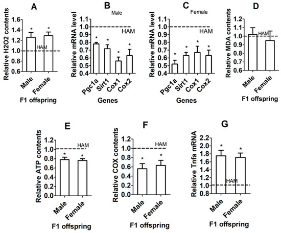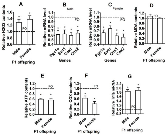 Effects of IVA on OS and mitochondria in hippocampi of F1 offspring. (A–G) Relative levels of H2O2, mRNA of mitochondrial function-related genes, MDA, ATP, cytochrome C oxidase (COX), and TNF-α mRNA, respectively, in hippocampi of male and female F1 offspring from freshly ovulated (FO) or IVA oocytes. Each treatment was repeated 6–8 (A), 6 (B,C), 5–6 (D,E), 4 (F) and 5–6 (G) times, with each replicate including one mouse from a different litter. The value in FO offspring was set to one and that in IVA offspring was expressed relative to one. * Significant difference (p < 0.05) from FO offspring. Refer to Table S3-4 for numbers of mice used in different graphs.