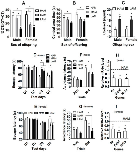 Anxiety-like behavior and spatial/fear learning/memory in F1 offspring after oocyte aging in media with different antioxidant potential. (A–I) Percentage OT/(OT + CT) of EPM test, times (s) in central area of OFT, serum cortisol concentration, escape latency (s) on different test days in MWM test, latency time (s) of acquisition (Acq) and retention (Ret) trials in PAT, and mRNA levels of Gr, Bdnf and Nr2a genes in hippocampi, respectively, in male and female F1 offspring after transfer of embryos from oocytes aged for 9 h in high (HAM)-, moderate (MAM)-, and low (LAM)-antioxidant medium. For RT-qPCR results, the value in HAM offspring was set to one (dotted line) and the value in LAM offspring was expressed relative to one. For behavioral tests, each treatment contained 16–24 mice from 8–10 recipients. For cortisol measurement, each treatment was repeated 6 times, with each replicate containing serum from one mouse from a different recipient. For RT-qPCR assays, each treatment was repeated 6 times, with each replicate containing one mouse from a different litter. * Significant difference (p < 0.05) from HAM oocytes. Refer to Table S3-6 for numbers of mice used in different graphs.
