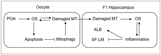 In conclusion, this study demonstrates that both IVA and low-antioxidant medium aging increased anxiety-like behavior while impairing spatial/fear learning/memory and hippocampal expression of anxiolytic and learning/memory-beneficial genes in both male and female F1 offspring. Furthermore, IVA and low-antioxidant medium aging increased OS with impaired mitochondrial function in oocytes, blastocysts, and hippocampi of F1 offspring. Our results suggest that within the oocyte, POA caused OS, which damaged mitochondria (MT) and triggered apoptosis (Figure 8). Apoptosis has frequently been reported in aged oocytes [21]. The damaged MT would produce more ROS [45] and aggravate OS and apoptosis. The apoptosis would impair mitophagy, leading to the accumulation and transmission to F1 hippocampus of the damaged MT. Within the F1 hippocampus, the damaged MT would increase OS, which would cause inflammation [46]. In turn, inflammation would aggravate OS [45]. It is known that inflammation causes anxiety and depressive disorders [47] and impairs cognition [27]. Together, the data show that POA is a crucial factor that causes psychological problems in offspring, and antioxidant measures may be taken to ameliorate the detrimental effects.