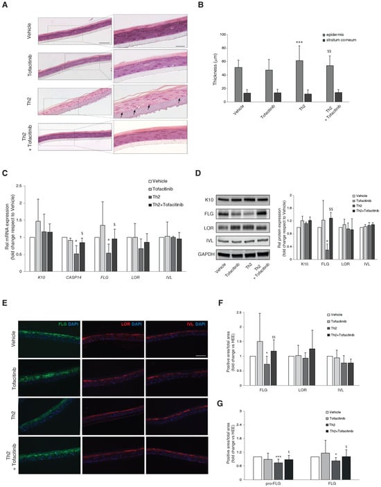 To reproduce the effects of Th2 cytokines in vitro, human epidermal equivalents (HEEs) were treated with IL-4 and IL-13, each at a concentration of 10 ng/mL, for five days. Conventional H&E staining of the 3D HEEs treated with the cytokines revealed histological features resembling AD epidermis in vivo. Occurrence of spongiosis was demonstrated by the expanded space between adjacent keratinocytes (Figure 1A, arrows). Morphometric analysis and quantitative evaluation of the thickness of both viable epidermis and SC showed a slight but statistically significant increase in the thickness of epidermal portion in Th2-treated HEEs compared to control. Tofacitinib partially counteracted the increased epidermal thickness induced by Th2 cytokines (Figure 1B). No significant modulation of the mRNA expression of the early differentiation marker K10 and the late differentiation markers LOR and IVL was detected after stimulation with Th2 cytokines (Figure 1C). According to previous evidence [9,28], Th2 cytokines caused a significant decrease in the mRNA levels of FLG and CASP14, which is the enzyme crucial for the FLG degradation process [29]. Tofacitinib treatment abolished the reduction of FLG and CASP14 mRNA observed in Th2-treated HEEs (Figure 1C). Consistent with the mRNA levels, protein quantification by both Western blot (Figure 1D) and immunofluorescence analyses (Figure 1E,F) showed a significant decrease in FLG expression in Th2-treated HEEs, which was prevented by tofacitinib. A similar result was obtained when profilaggrin (pro-FLG) and FLG expression were analyzed separately in the stratum granulosum (SG) and the stratum corneum (SC) (Figure 1G).