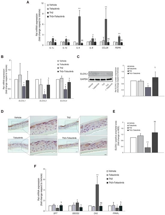 Effects of JAK/STAT inhibition by tofacitinib on the Th2-mediated changes in the expression of inflammatory and lipid genes. Quantitative RT-PCR analysis of (A) IL-1α, IL-1β, IL-6, IL-8, CCL26, and PDPN (B) ELOVL1, ELOVL3, and ELOVL4, performed on 3D HEEs and Th2-HEEs treated with tofacitinib. All values of mRNA expression were normalized against the expression of GAPDH and were expressed relative to vehicle (taken as 1). Data represented the mean ± SD of three independent experiments; * p ˂ 0.05, ** p ˂ 0.01 vs. vehicle; $ p ˂0.05, $$ p ˂ 0.01 vs. Th2. (C) Western blot analysis of ELOV1 protein expression performed on 3D HEEs and Th2-HEEs treated with tofacitinib. Representative blots are shown. GAPDH was used as the loading control. Densitometric scanning of band intensities was performed to quantify the change in protein expression. Results were expressed as the fold change respect to vehicle (taken as 1-fold). Data represented the mean ± SD of three independent experiments; * p ˂ 0.05 vs. vehicle; $ p ˂ 0.05 vs. Th2; (D) Immunohistochemical and (E) quantitative analyses of ELOVL1 on 3D HEEs and Th2-HEEs treated with tofacitinib. Nuclei were counterstained with hematoxylin. Scale bars: 20 µm, 10 µm. ** p ˂ 0.01 vs. vehicle; $$ p ˂0.01 vs. Th2. (F) Quantitative RT-PCR analysis of SPT, DEGS2, CA2, and PPARγ, performed on 3D HEEs and Th2-HEEs treated with tofacitinib. All values of mRNA expression were normalized against the expression of GAPDH and were expressed relative to vehicle (taken as 1). Data represented the mean ± SD of three independent experiments; * p ˂ 0.05, ** p ˂ 0.01 vs. vehicle; $ p ˂ 0.05, $$ p ˂ 0.01 vs. Th2.