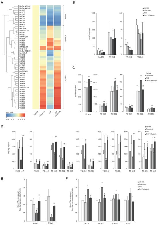 Th2 cytokines IL-4 and IL-13 induce lipid changes through the activation of JAK/STAT pathway. (A) Hierarchical clustering of 51 lipid species resulted significantly modulated in the one-way ANOVA applied to the amounts of the 300 characterized lipids. (B) Ultra-long chain SFAs determined by LCMS. Profiles of abundance of (C) PCs determined by HILIC-MS and of (D) Palmitoleic acid (FA 16:1n-7) determined by GCMS and TGs determined by RP-LCMS in lipid extracts of 3D HEEs treated with vehicle, tofacitinib, Th2 cytokines, and combined tofacitinib and Th2 cytokines. Molar amounts of individual lipids were calculated against same-class deuterated internal standards and were normalized by the protein concentration and expressed as pmol/mg protein. Real Time RT-PCR analysis of (E) PLIN1 and PLIN2, (F) CPT1α, ACAT1, ACADS, and ACOX1, performed on 3D HEEs and HEEs treated with Th2 cytokines and tofacitinib. All values of mRNA expression were normalized against the expression of GAPDH and were expressed as relative to the vehicle (taken as 1). Data represented the mean ± SD of three independent experiments; * p ˂ 0.05, ** p ˂ 0.01 vs. vehicle; $ p ˂ 0.05, $$ p ˂ 0.01 vs. Th2.
