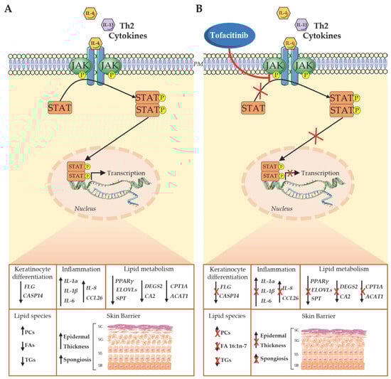 Effect of Th2 cytokines and tofacitinib on JAK/STAT signaling. (A) After stimulation with Th2 cytokines (IL-4 and IL-13), activated JAK phosphorylates STATs, which dimerize and translocate to the nucleus. Upon binding to DNA, STATs regulate the transcription of selected genes involved in keratinocyte differentiation, inflammation, and lipid metabolism. As a result, lipid profiles are altered, and the epidermis becomes thicker due to an increase of the space between adjacent keratinocytes. (B) Tofacitinib suppresses STAT phosphorylation through JAK inhibition, counteracting Th2-dependent alterations. PM: plasma membrane; SC: stratum corneum; SG: stratum granulosum; SS: stratum spinosum; SB: stratum basale.
