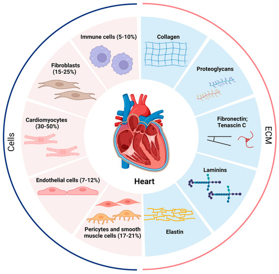 Proportion of various cells in the heart and composition of the ECM. The human heart at homeostasis consists of roughly 5–10% immune cells, 15–25% fibroblasts, 30–50% cardiomyocytes, 7–12% endothelial cells, and 17–21% pericytes and smooth muscle cells, and the cellular proportions change dramatically when the heart is under stress or other stimuli. The extracellular matrix (ECM) is secreted mainly by fibroblasts and contains collagen, proteoglycans, fibronectin, tenascin C, laminins, and elastin. The pathological increase in fibroblasts and the abnormal deposition of ECM lead to the development of cardiac fibrosis.