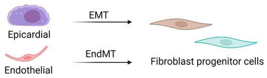 CFs are mesenchymal cells that are derived from the embryonic mesoderm that undergo epithelial-to-mesenchymal (EMT) and endothelial-to-mesenchymal (EndMT) transitions to migrate into and populate the heart early in development (Figure 2) [13,14]. A resident population of fibroblasts is maintained through adulthood, but details of their turnover and life cycle remain unknown. Several studies have suggested that other cell types, including hematopoietic fibroblast progenitors [15,16,17,18], endothelial cells [19,20], and macrophages [21,22], may directly transdifferentiate into fibroblasts or myofibroblasts after injury. However, the limitations of available techniques and models have challenged these theories, and definitive evidence of transdifferentiated cell types contributing to the cardiac fibroblast cell pool is lacking. Interestingly, new genetic tracing models allow for the visualization of multiple lineage-traced fibroblast populations within the same mouse. These observations also substantiate single-cell transcriptome analyses that have identified multiple fibroblast or fibroblast-like populations in the heart. While these are critical breakthroughs in our knowledge of cardiac biology, they uncover complications associated with accurately targeting a desired population of fibroblasts to abrogate fibrosis.