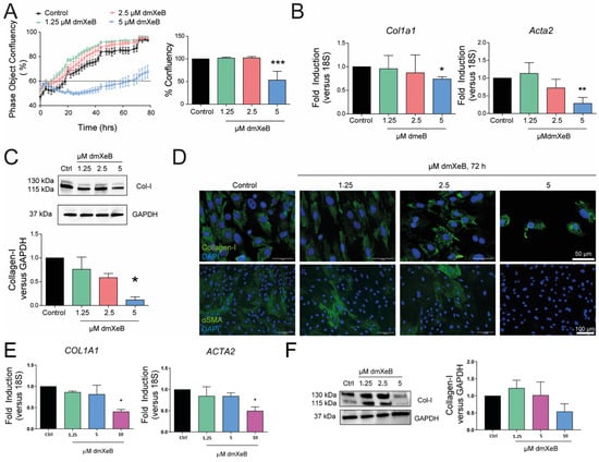DmXeB prevents HSC proliferation, activation, and migration: Primary rat HSCs were culture-activated in vitro for 7 days and then treated for 72 h with 0–5 µM dmXeB (A–D); LX-2 cells were treated with 0–10 µM dmXeB for 72 h with 0–10 µM dmXeB (E,F). (A) Proliferation was assessed using real-time automatic imaging (right panel) and confluency was calculated after 72 h of treatment. (B) mRNA expression of Col1a1 (left panel) and Acta2 (right panel). (C) Representative Western blots of collagen type I and GAPDH. Bar graph: Collagen-I/GAPDH and αSMA/GAPDH expressed as average fold change over basal levels. (D) Representative images of immunofluorescence microscopy of collagen type I (in green) and DAPI (in blue) (top panels) and αSMA (in green) and DAPI (in blue) (lower panels) of cells treated with dmXeB. Scale bar, 50 µm (top panels) and 100 µm (lower panels) (n = 3). (E) mRNA expression of COL1A1 (left panel) and ACTA2 (right panel). (F) Representative Western blots of collagen type I and GAPDH. Bar graph: collagen/GAPDH expressed as average fold change over basal levels. Scale bar, 50 µm (n = 3). n = 3–4, mean ± SEM, * p < 0.05, ** p < 0.001, *** p < 0.0001 (one-way ANOVA).