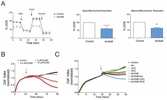 Desmethylxestospongin B (dmXeB) (0–10 µmol/L), Ru360 (0–10 µmol/L, Sigma-Aldrich, San Luis, MO, USA), dimethyl α-ketoglutarate (5 mmol/L, Sigma-Aldrich), methyl pyruvate (5 mmol/L, Sigma-Aldrich), nucleosides mix (adenosine, cytosine, guanosine, uridine, and thymidine, 100 µmol/L each, Sigma-Aldrich).