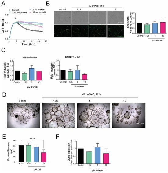 Toxicity of dmXeB to other liver cells: Primary rat hepatocytes were treated with 0–10 µM dmXeB for 24 h (A–C). (A) Cell proliferation rate during 24 h of treatment. Arrow represents the start of treatment. (B) Bright field images (upper panel) and Sytox green staining (bottom panel) of hepatocytes treated for 24 h. Bar graph: cell death calculated by quantifying necrotic (stained) nuclei as expressed as fold induction over control (n = 3, mean ± SEM, bar = 100 µm). (C) mRNA of albumin and BSEP after 24 h of treatment. Primary human liver organoids were treated with 0–10 µM dmXeB for 24 h (D–F). (D) Bright field pictures of human liver organoids treated for 72 h. (E) Diameter of organoids after treatment. (F) mRNA expression of LGR5 after treatment. n = 3, mean ± SEM, **** p < 0.0001 (two-way ANOVA with Tukey’s multiple comparisons).